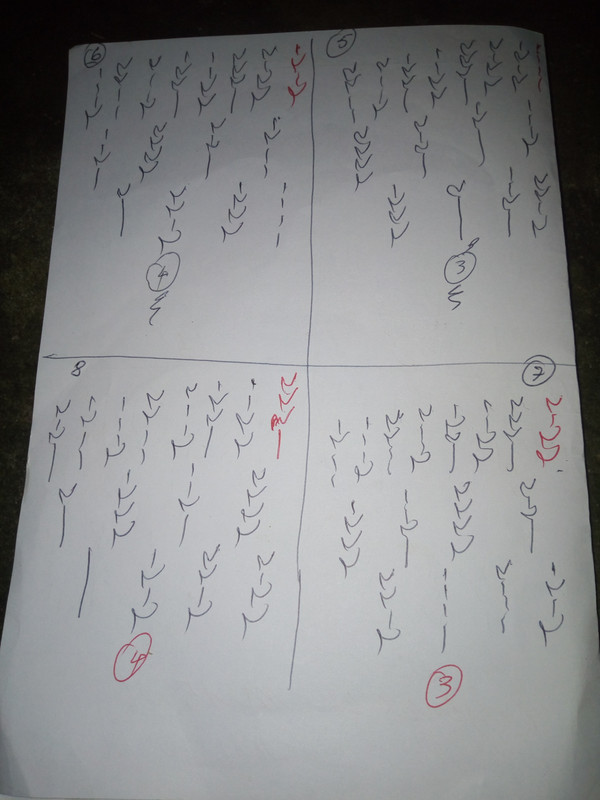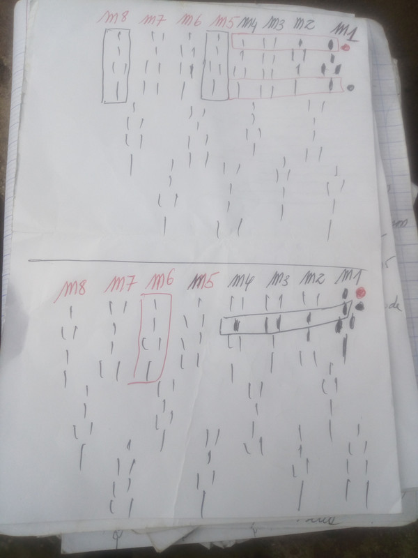 Par contre, la flèche de tête Feu est ouvert, mais quand on compare avec le cou fermé (2 points) de la figure (1222) en M1, alors (1222) en M1 ne vient jamais en répétition en M6,car les points ne sont pas identiques, le point de la tête feu est ouvert et son ventre est fermé (2points) ,ici les points ne sont pas identiques alors (1222) en M1 ne vient jamais en répétition en M7,et la tête Feu est ouvert, (1 point) par contre les pieds de (1222) est fermé,(2points) donc 1 point de la tête Feu (1222) et son pieds ne sont pas identiques donc (1222) en M1, ne vient jamais en répétition en M8.