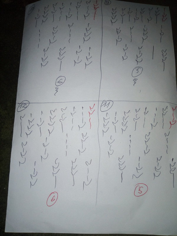 Tarki brama (Via la Voie) =4 points ou 4 traits, donc pour le calcul on aura 4*1= 4 points ou 4 traits, pour Sediou, Dianfa almamy, Youssouf (puer le jeune garçon), totigui garlan, Younoussa (puella, la jeune fille) ,madi, malidiou goumba, Mouhamad( caput draconis, la tête du dragon), et Lahocina, Alhassane, Hassan (caudas draconis) ont tous également 5 points ou 5 traits , d’où le total donne 4 *5 =20, points ou 20 traits, car nous avons 4 figures de 5 points ou traits, les figures comme :