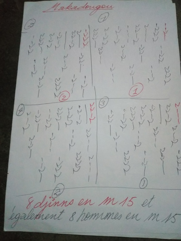 Adama, Laetitia (1222), madi, caput draconis (2111), n’gnazan, Issa, Amissio (1212), Almankouchi, Ayoub, Tristitia) 2221), Kalallaw, aboubakr Sidik, Fortuna minor(1122), Nounkôrô, Nouh, Fortuna major (2211), Lahocina, caudas draconis, Hassan, (1112), et Mori Zoumana, Ousmane, Acquisitio (2121) qui une fois en m1 , ne viennent jamais en répétition en m8,