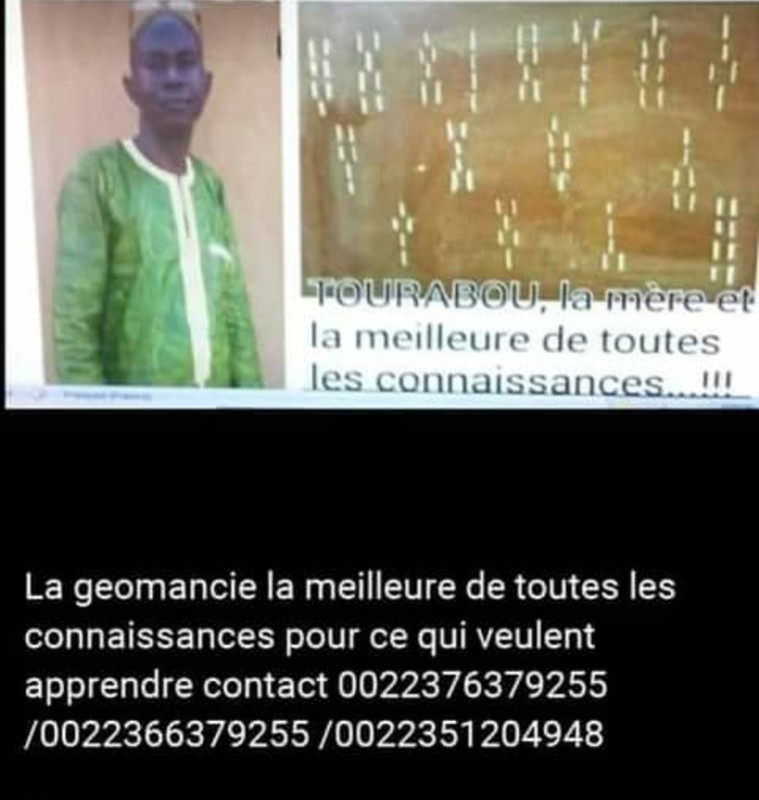 Prendre une feuille blanche, dessiner un petit cercle dans lequel vous mettez la figure de Souleymane et à l’intérieur de cette figure, vous mettez le besoin comme rester dans tel pays et ne pas être refouler. Tracez des figures de Souleymane tout autour du grand cercle au nombre de 1000, puis prendre une peinture noire ou charbon que vous racler sur tout le papier jusqu’à ne plus distinguer les écrits et aller l’enterrer dans les ordures.