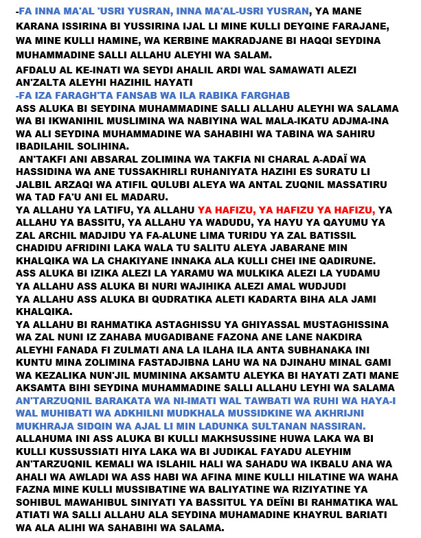 Bonsoir chers maîtres du Blog MHD. Bientôt ma coopérative publiera la liste de bénéficiaires de parcelles de terrains pour habitation. J’ai tous les documents demandés et l’apport financier pour deux terrains mais ce n’est pas suffisant, je veux dire que ce n’est pas une garantie pour qu’on m’attribue les terrains que j’ai demandés. Je parle en connaissance de cause parce que trois distributions me sont passées sous le nez ces quatre dernières années, malgré mes lettres de relance au prèsident de notre GIE et même des protestations. J’explique tout cela pour demander, supplier les maîtres de m’offrir un/des zikrs pour que cette fois-ci on ne « m’oublie pas ».