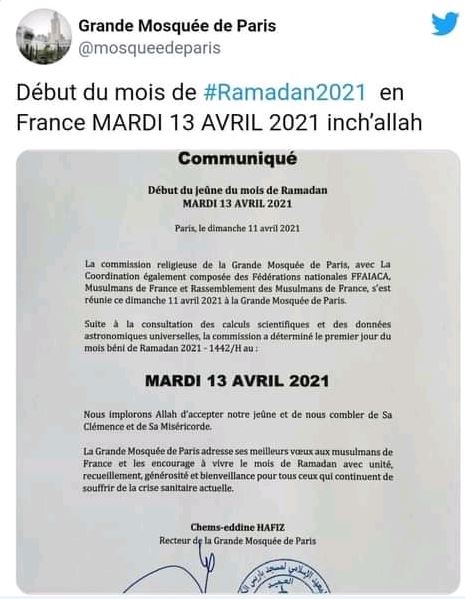 En France la mosquée de Paris a opté pour les calculs scientifiques et a annoncé mardi 13 avril 2021 comme début du mois de ramadan 1442.