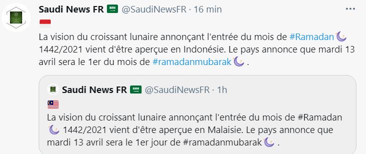 Selon le site SAUDI.NEWS.FR la Malaisie et l’Indonésie ont déjà aperçu le croissant lunaire et démarreront le mois de ramadan 1442, mardi 13 Avril.