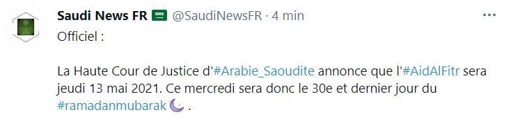 EN ARABIE SAOUDITE, il n’a pas été possible d’observer le croissant lunaire ce mardi soir et l’AÏD EL FITR est annoncée pour le jeudi 13 Mai. Les calendriers officiels en Arabie saoudite et en Turquie affichent tous jeudi 13 Mai comme début du mois lunaire SHAWWAL 1442.