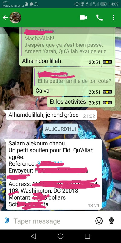 Alhamdou lillah le lendemain juste après le Salam de la prière de Djoum’an, j’ai eu ce message notifiant une aide financière pour l’aide.