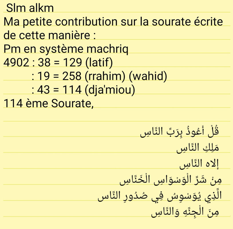 Moi, ce que je sais le mieux c’est l’examination et l’interprétation des nombres en rapport avec le «secret» ; je lis dans le nombre comme le géomancien lit dans le sable. Zâlika fadhloul lâhi. Cependant ce que je sais est limité, cela va sans dire. Wa lillâhil hamdou !