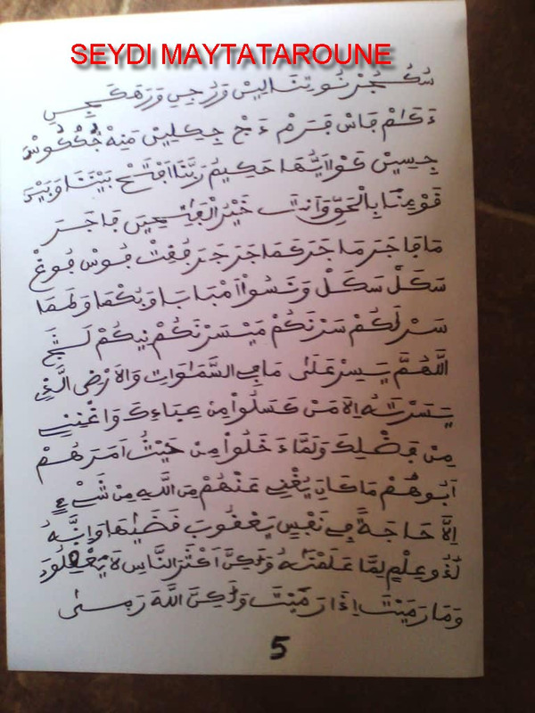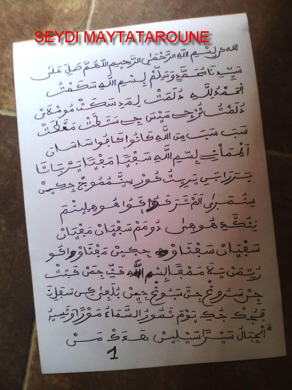 Seydi Maytataroun, vous voulez mon apport sur votre talsam. Ce n’est pas mon point fort. Je retiens ou garde un talsam seulement lorsque je reçois les enseignements complets le concernant. Je ne reçoit pas de quiconque ; pas donc de prise de risque, pas de doute, je considère toujours en premier lieu la source de transmission. C’est la loi du tout ou rien. Croyez-moi je crois avoir raison d’agir de la sorte.